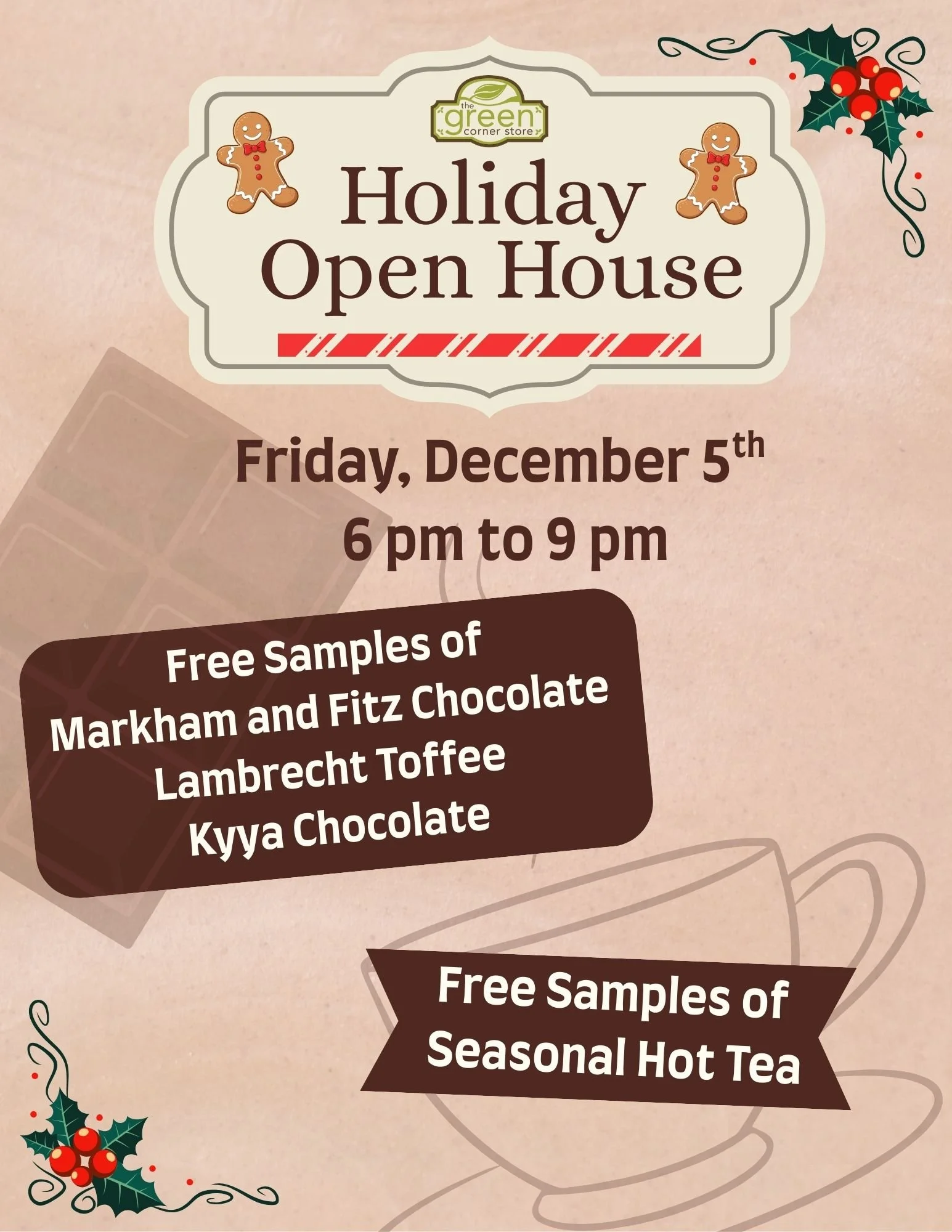 Back to All Events Holiday Open House Friday, December 5, 2025 6:00 PM 9:00 PM The Green Corner Store (map) Google Calendar ICS 🎄✨ Join us for our Holiday Open House! ✨🎄Stop by on Friday, December 5th from 6–9 pm for free chocolate samples from your local favorites and warm seasonal tea tastings. The sweetest way to kick off the holidays!